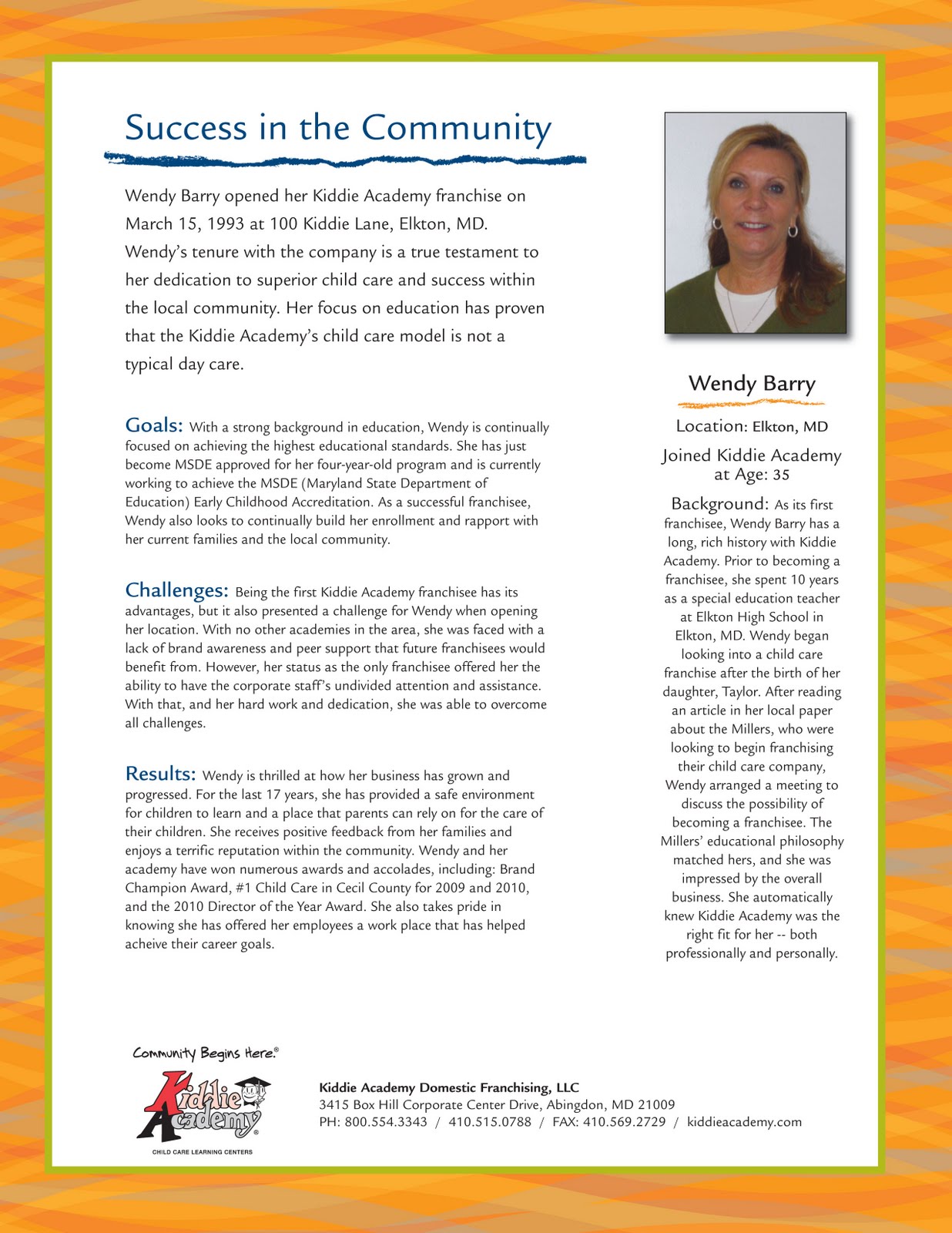 Results: Wendy is thrilled at how her business has grown and progressed. For the last 17 years, she has provided a safe environment for children to learn and a place that parents can rely on for the care of their children. She receives positive feedback from her families and enjoys a terrific reputation within the community. Wendy and her academy have won numerous awards and accolades, including: Brand Champion Award, #1 Child Care in Cecil County for 2009 and 2010, and the 2010 Director of the Year Award. She also takes pride in knowing she has offered her employees a work place that has helped achieve their career goals. *The information in this post was provided from this document*