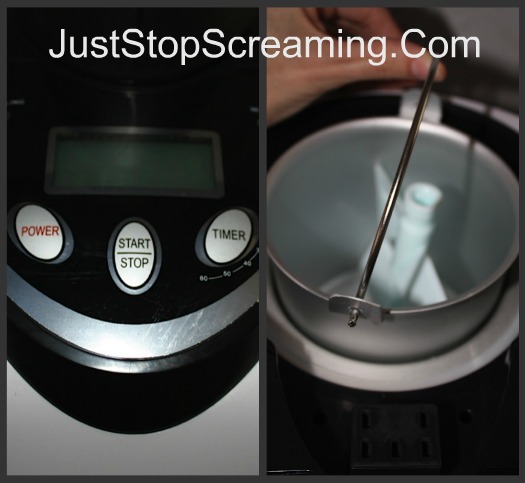 You see 5 ingredients there but that is because I thought I was going to add cookies to make cookies and cream, then completely forgot to add the cookies the last 5 minutes.  All you need for a base ice cream of vanilla is 4 ingredients…milk, sugar, heavy cream and vanilla.  Who new ice cream could be so free of additives and easy to make!  Well unless you, like me,  are going to add cookies.   After mixing the ingredients together I simply poured into the maker through the pour spout and set the timer for 60 minutes.