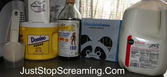 I grabbed up my ingredients. The only work I had to do outside of actually measuring and pouring was mix the sugar and milk together with a hand blender, after that it was pour ingredients together, stir and pour into the ice cream maker.  Simple enough that even my tween could have done this with no help.
