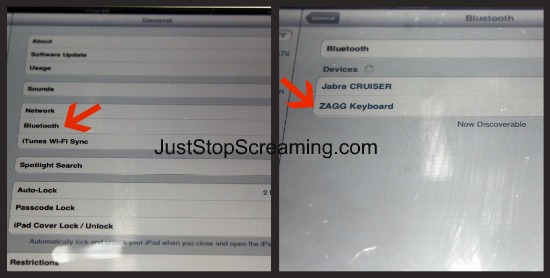 Isn’t it a professional looking accessory! The keyboard of the Zaggfolio is blue tooth connected. It’s so easy that if yours truly here can connect it, pretty much anyone can. No wires, plugs, etc. needed. You simply turn the keyboard from the off to the on position, head into your iPad 2 bluetooth area (in settings), enable bluetooth, start pairing mode, enter code and voila it’s connected.